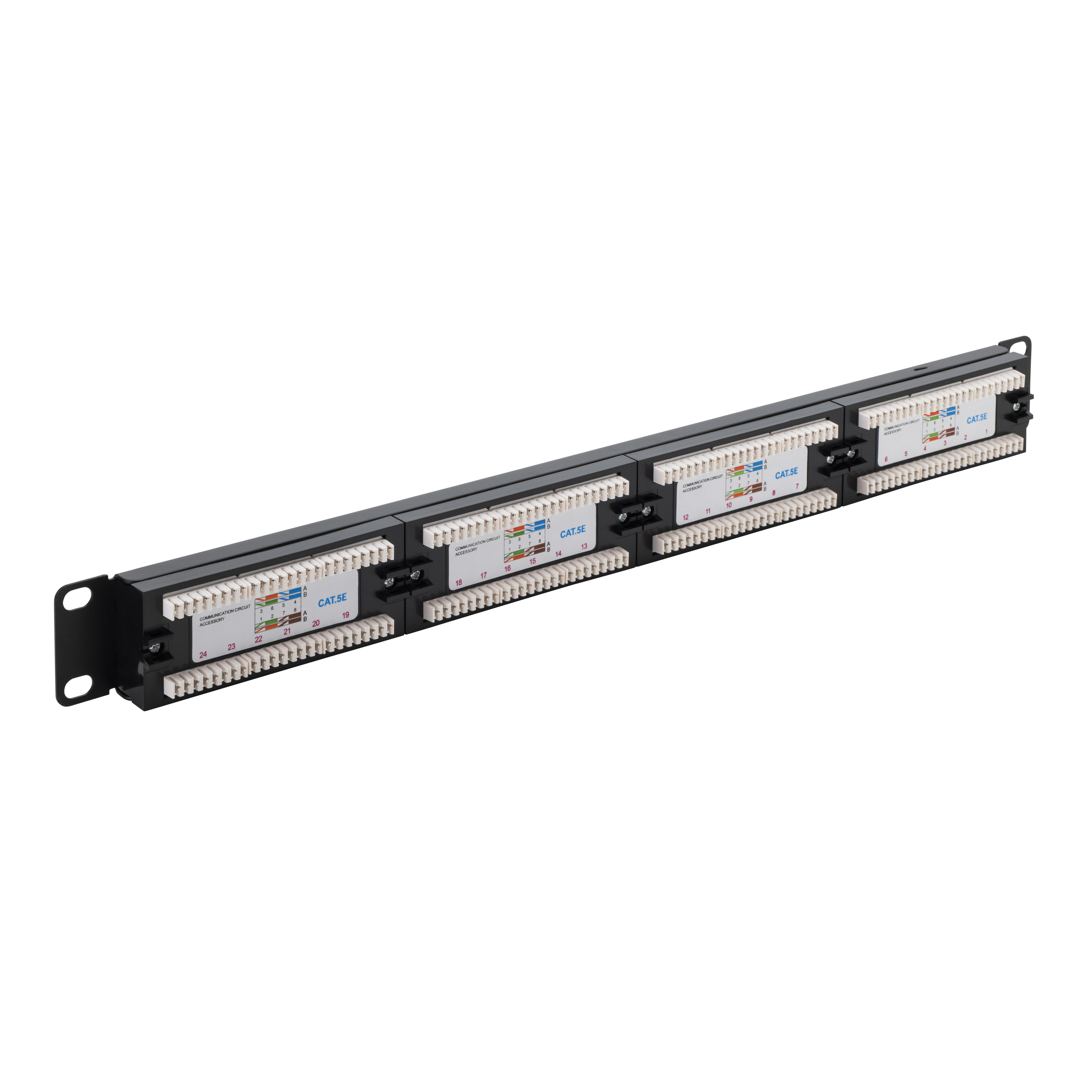 Our CAT5e patch panel is designed to manage and organise your network connections, featuring 24 ports on the front for easy access and the corresponding termination points on the back. It also features removable cards on the front of the panel for personalisation which allows you to connect cables from your PCs, printers and router without error. These are commonly used in data centres and telecommunications rooms to simplify network management.
