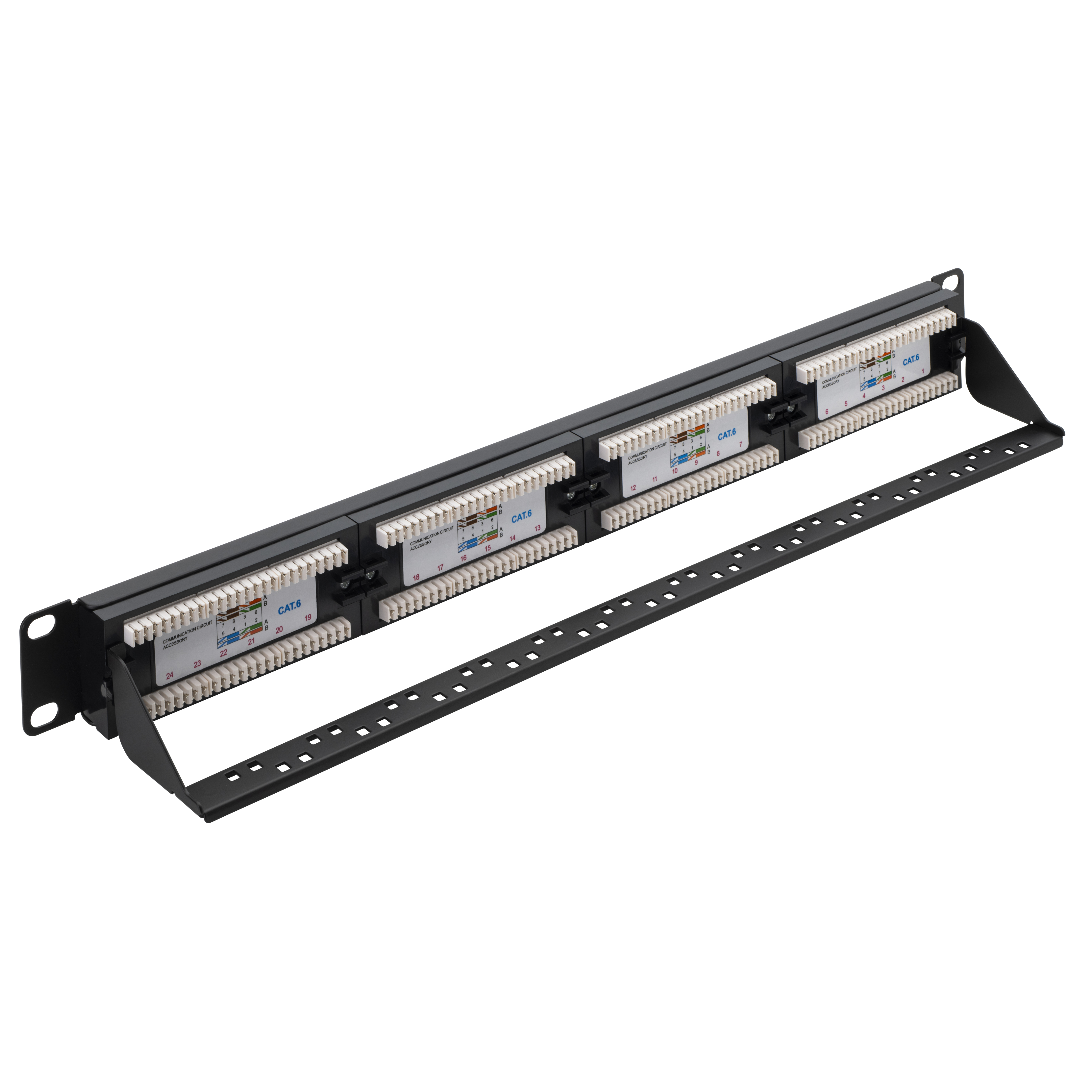 Our CAT6 patch panel is designed to manage and organise your network connections, featuring 24 ports on the front for easy access and the corresponding termination points on the back. It also features removable cards on the front of the panel for personalisation which allows you to connect cables from your PCs, printers and router without error. These are commonly used in data centres and telecommunications rooms to simplify network management. This also includes a lacing bar to avoid cable stress and help keep them tidy.