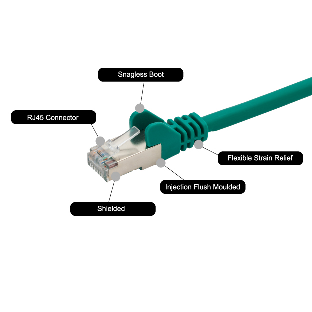 They are injection flush moulded meaning the boot is no larger than the RJ45 connector itself. This keeps the cable slim and easy to plug into devices like patch panels or side by side ports. The design also provides strain relief which reduces cable stress and lowers the risk of being damaged. In addition, the snagless boots protect the clip from breaking. Together, these features deliver enhanced durability, improved longevity and a professional appearance.