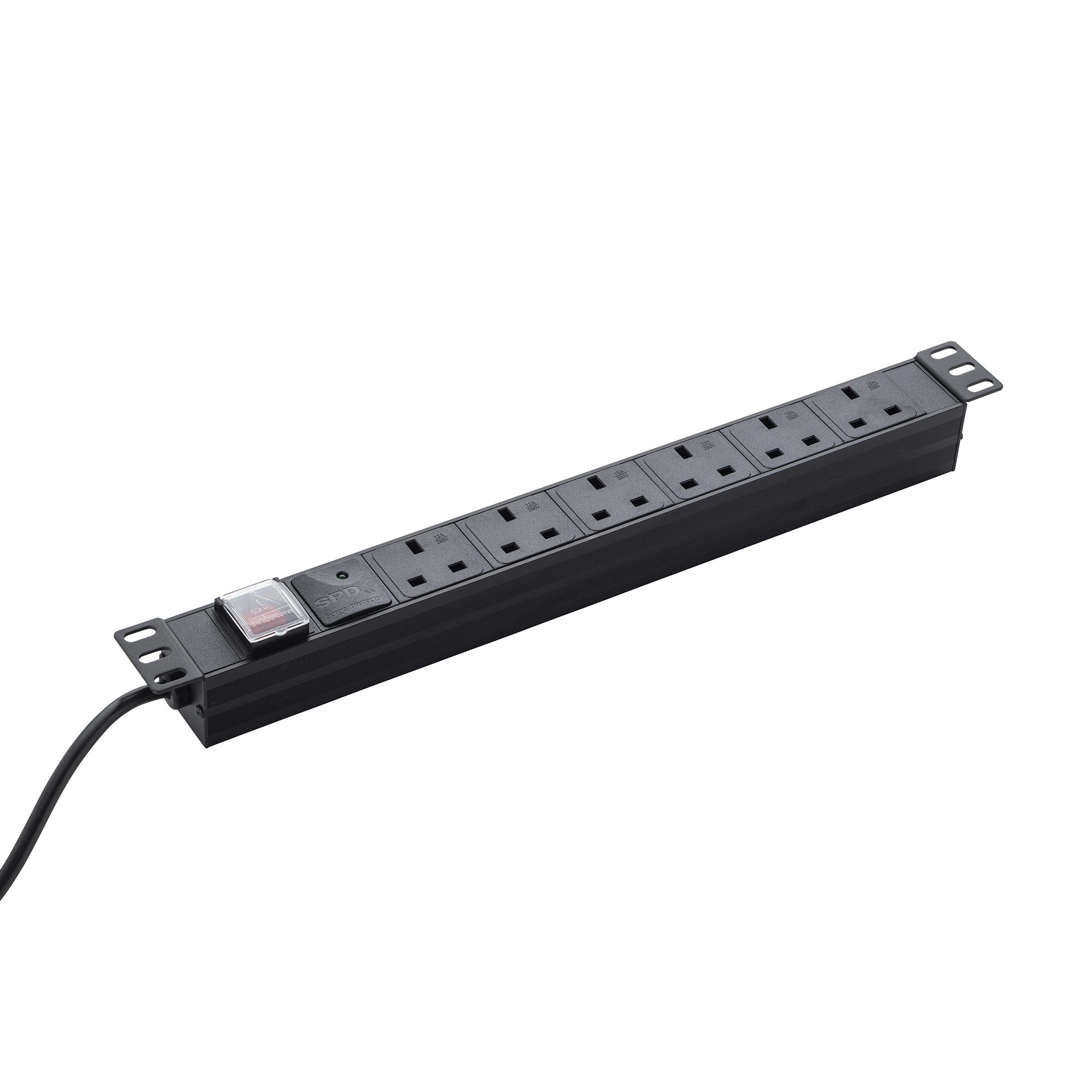 3m 6 Way Surge Protected Horizontal Rack Mount Power Extension Block UK Plug to 6 x UK Sockets - Black