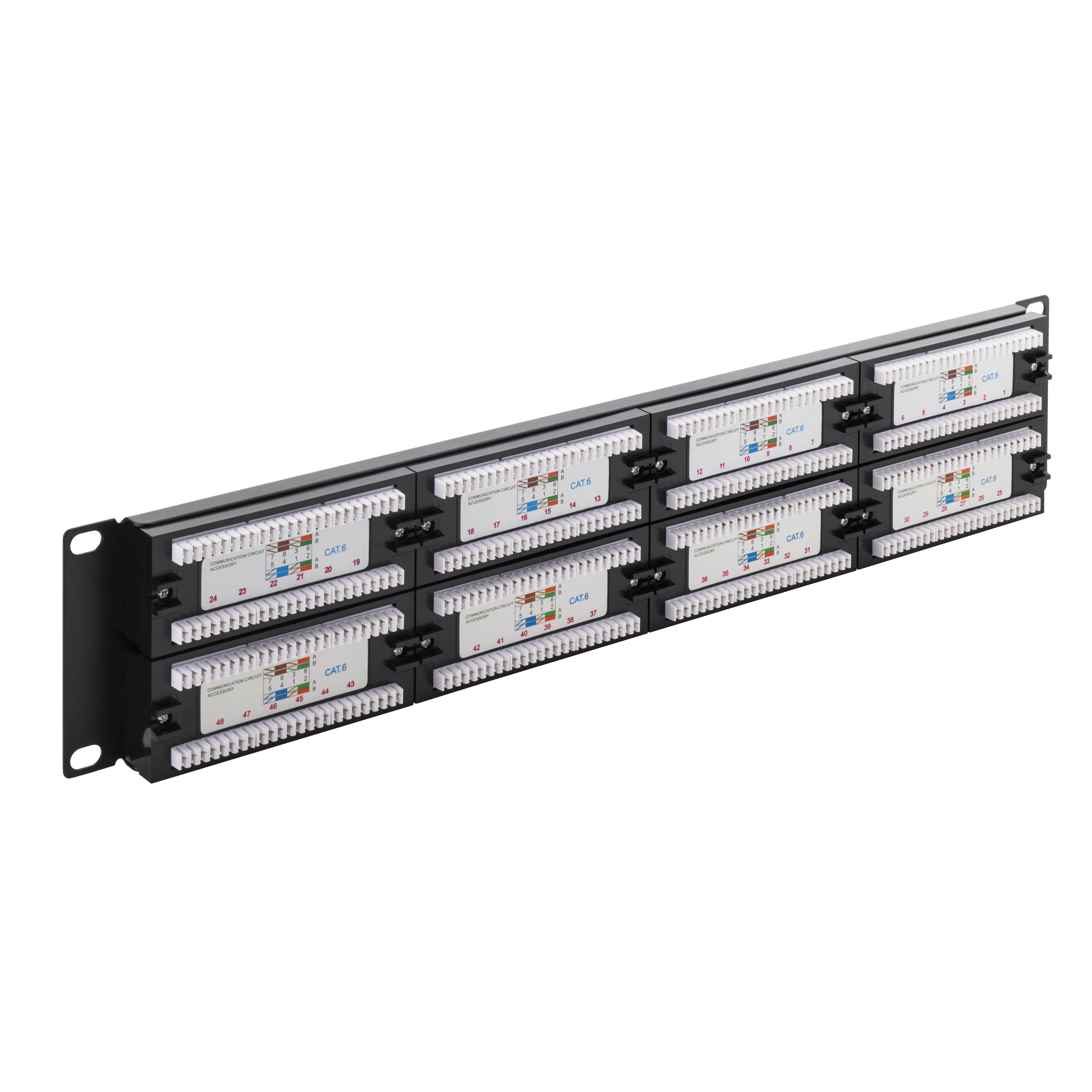 Our CAT6 patch panel is designed to manage and organise your network connections, featuring 48 ports on the front for easy access and the corresponding termination points on the back. It also features removable cards on the front of the panel for personalisation which allows you to connect cables from your PCs, printers and router without error. These are commonly used in data centres and telecommunications rooms to simplify network management.