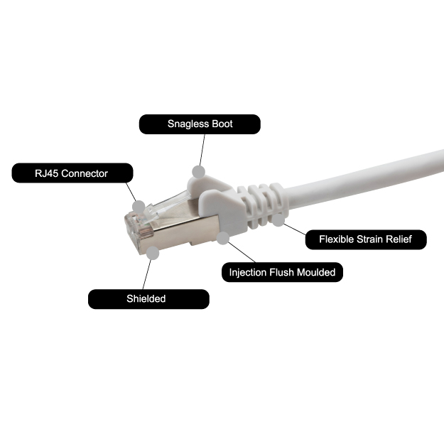 They are injection flush moulded meaning the boot is no larger than the RJ45 connector itself. This keeps the cable slim and easy to plug into devices like patch panels or side by side ports. The design also provides strain relief which reduces cable stress and lowers the risk of being damaged. In addition, the snagless boots protect the clip from breaking. Together, these features deliver enhanced durability, improved longevity and a professional appearance.