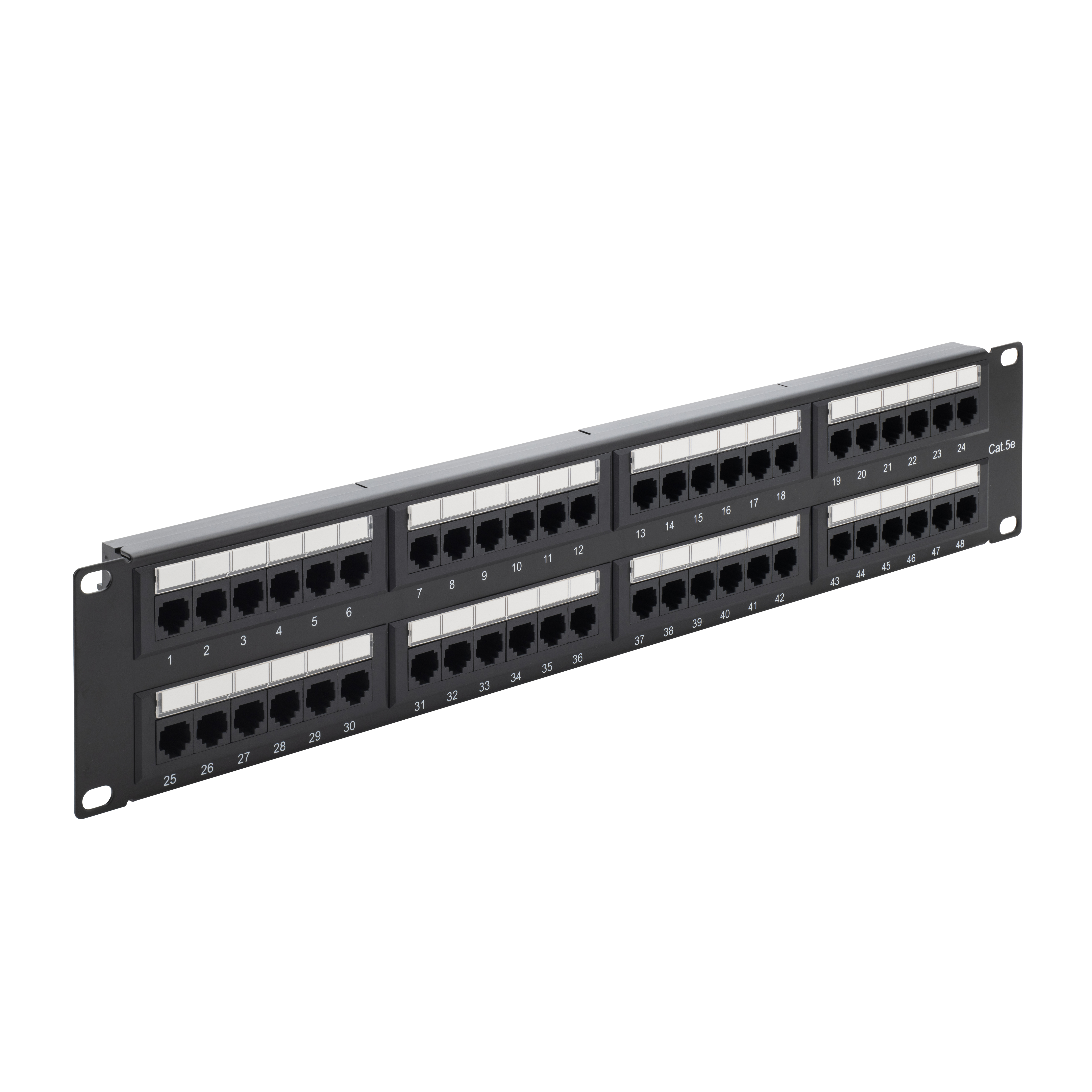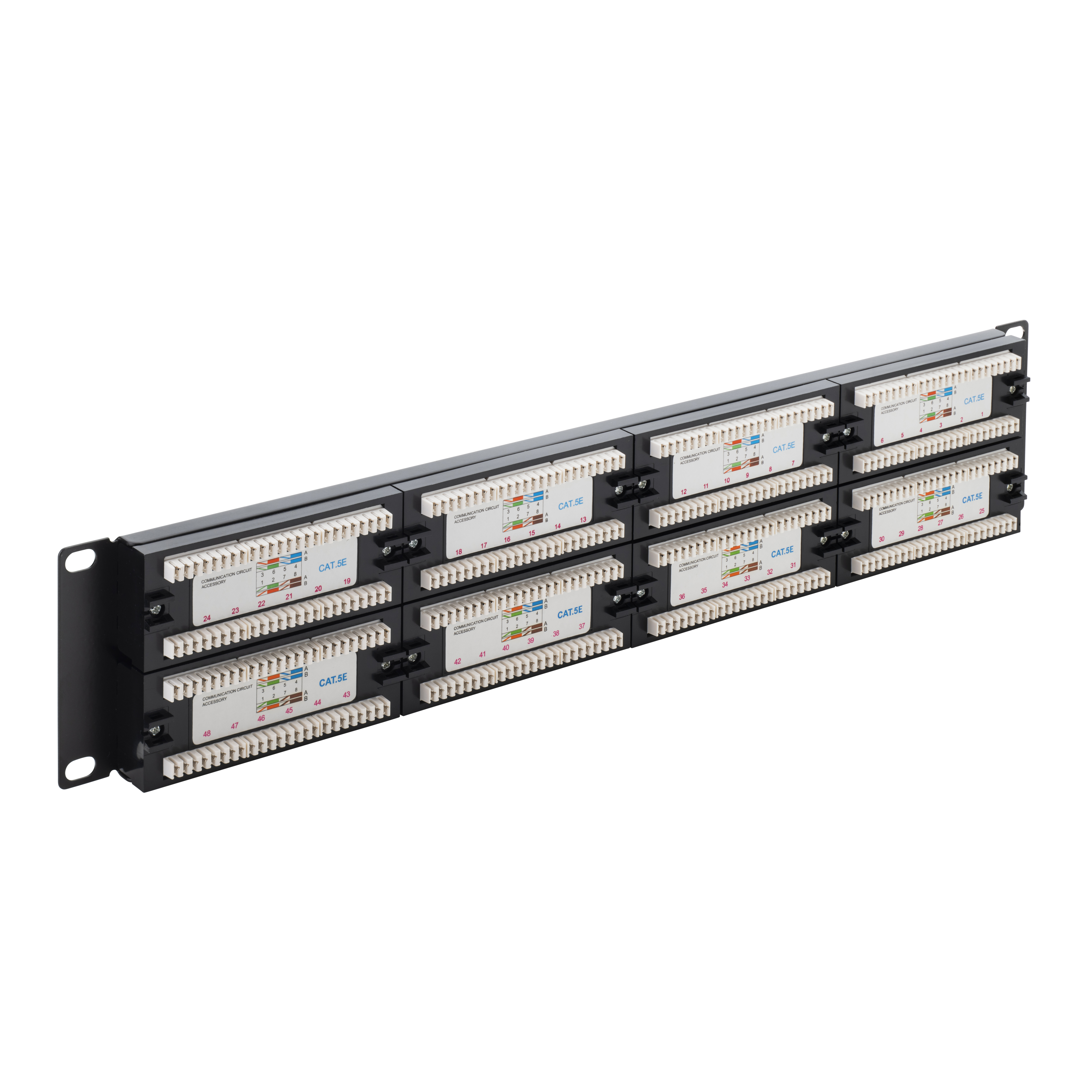 Our CAT5e patch panel is designed to manage and organise your network connections, featuring 48 ports on the front for easy access and the corresponding termination points on the back. It also features removable cards on the front of the panel for personalisation which allows you to connect cables from your PCs, printers and router without error. These are commonly used in data centres and telecommunications rooms to simplify network management.